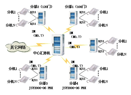 2)中心交换机与其它子网交换机通过PCM的E1(NO.7信令)进行汇接,并实现等位拨号;