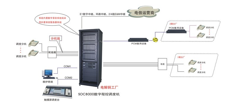 SOC8000B数字程控电话调度主机设在电解铜工厂总部主控制室内。电话将安装在运行和维护系统要求的公司各层、所有房间、电气室和控制室、锅炉区、空压机房、煤仓和煤转运区、水处理及其他(相关)区域等共512部,系统内置数字录音系统40路。